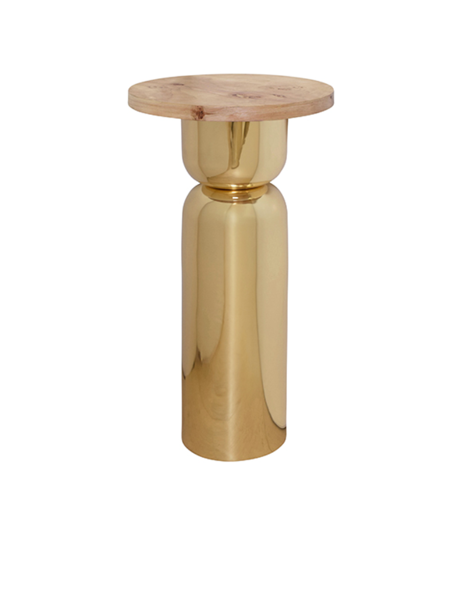 HOURGLASS BRASS BASE SIDE TABLE WITH ROUND BURL WOOD TOP