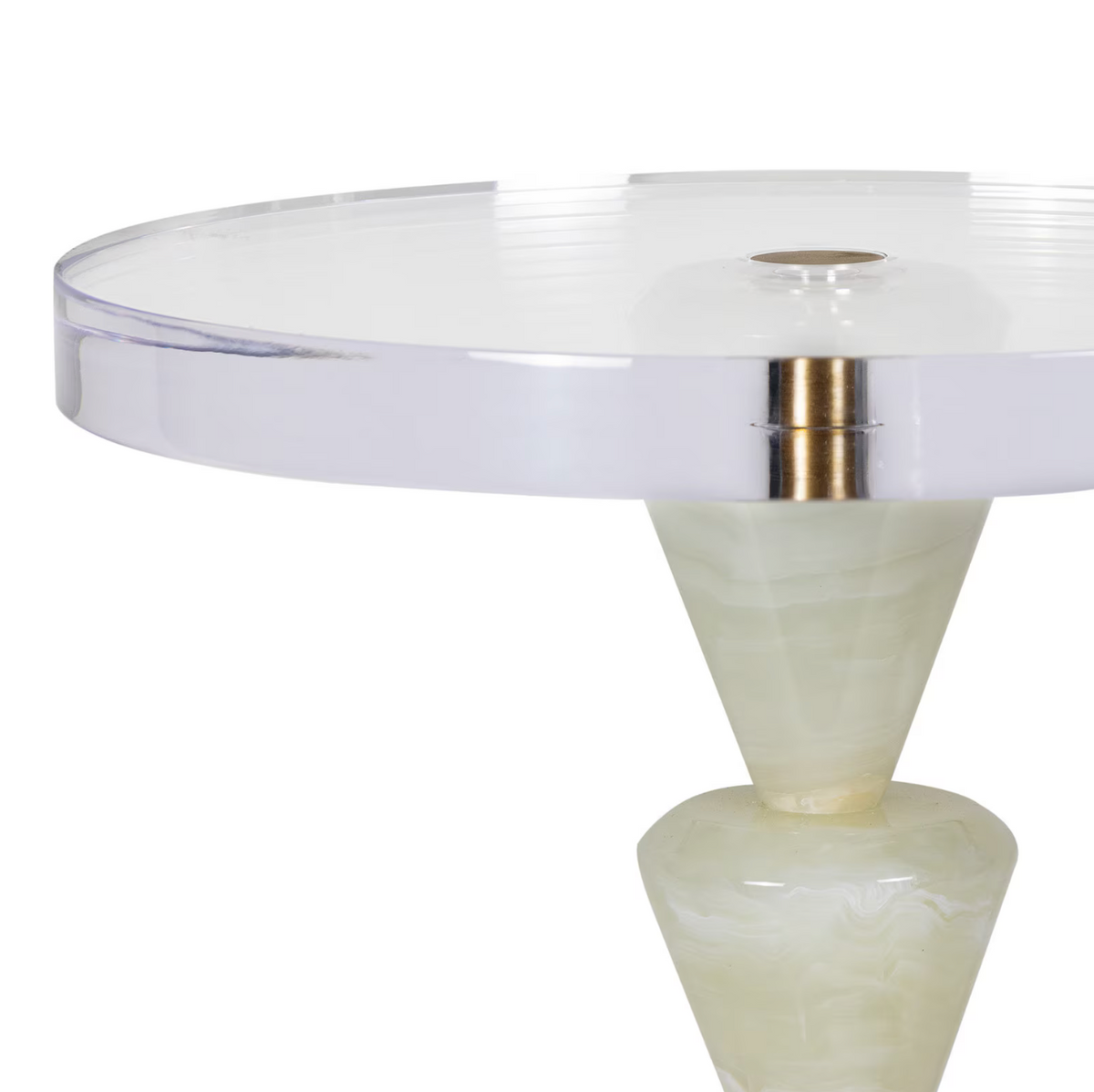 The Patricia Jade Accent Table combines sophistication with distinctive design, mirroring the elegance of our Patricia Lamp. Featuring a base crafted from natural jade stone with downward-facing cone shapes that taper into a sturdy, refined base, this table adds a sculptural touch to any space. Topped with a circular crystal tabletop, it provides both functionality and a striking visual element, enhancing your decor with timeless style and durability.